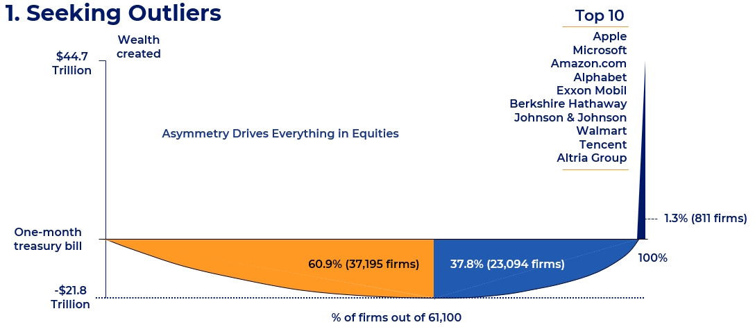 Maxwell verwees naar een baanbrekende studie die de rendementen van meer dan 61.000 wereldwijde aandelen analyseerde. De conclusie was schokkend. Slechts 1,3% van alle bedrijven (811 in totaal) was verantwoordelijk voor 100% van alle netto gecreëerde beurswaarde bovenop staatsobligaties, omdat 37,8% van de winst van de winnaars het verlies van de 60,9% losers moest compenseren. De overige 98,7% van de bedrijven presteerde daardoor per saldo slechts gelijk aan risicovrije T-bills. De missie van Scottish Mortgage is dan ook niet om de markt te volgen, maar om uitsluitend die 1,3% “outliers” te vinden en vast te houden.