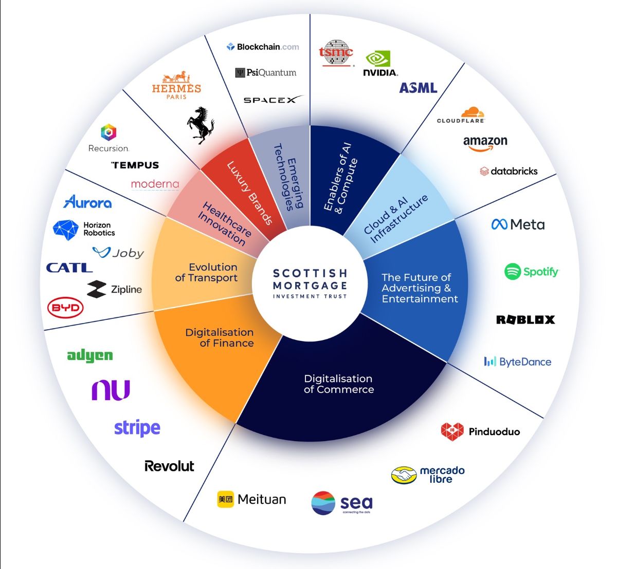 Deze zoektocht naar “outliers” brengt Scottish Mortgage allereerst bij “Transformationele Groeithema’s”. Dit zijn de structurele trends die de komende decennia zullen domineren. Voorbeelden zijn de digitalisering van de handel (met posities als Amazon en Mercado Libre), de digitalisering van de financiële wereld (Stripe, Revolut), de evolutie van transport (SpaceX, Joby), en natuurlijk de ‘Enablers of AI’ (TSMC, NVIDIA, ASML).