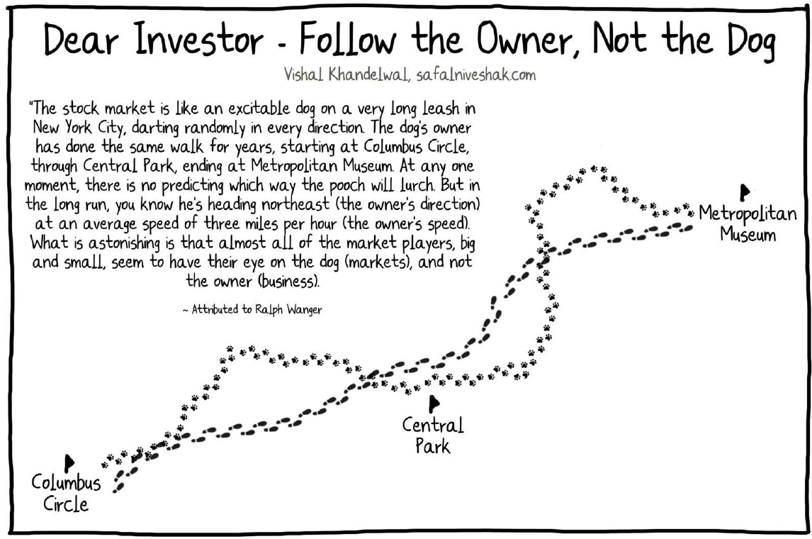 De kernboodschap van de avond was duidelijk: laat u niet leiden door de grillen van de markt op de korte termijn. Zoals de metafoor ‘Follow the Owner, Not the Dog’ in bovenstaande figuur illustreert, de markt (de hond) mag dan alle kanten op schieten, de onderliggende waarde van de bedrijven (de eigenaar) volgt een voorspelbaarder pad. Wij volgen dus de eigenaar.