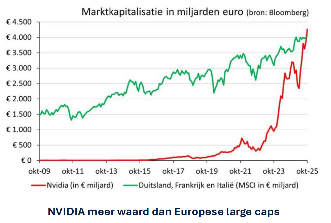 Michel Salden schetste vervolgens de macro-economische vooruitzichten. Hij opende met een beeld van Europa als ‘de zieke man’, visueel voorgesteld als een patiënt aan een infuus van de ECB, onder toeziend oog van Christine Lagarde. Deze stagnatie, gecombineerd met stijgende staatsschulden, leidt onvermijdelijk tot een onvriendelijker fiscaal klimaat en een zoektocht naar hogere belastingen, wat een kapitaalvlucht uit de regio aanjaagt. Om de disbalans in de wereld te illustreren, toonde hij een veelzeggende grafiek (hieronder afgebeeld). De marktkapitalisatie van één enkel AI-bedrijf, Nvidia, is in 2025 groter geworden dan de gecombineerde beurswaarde van de belangrijkste large caps in Duitsland, Frankrijk en Italië samen.