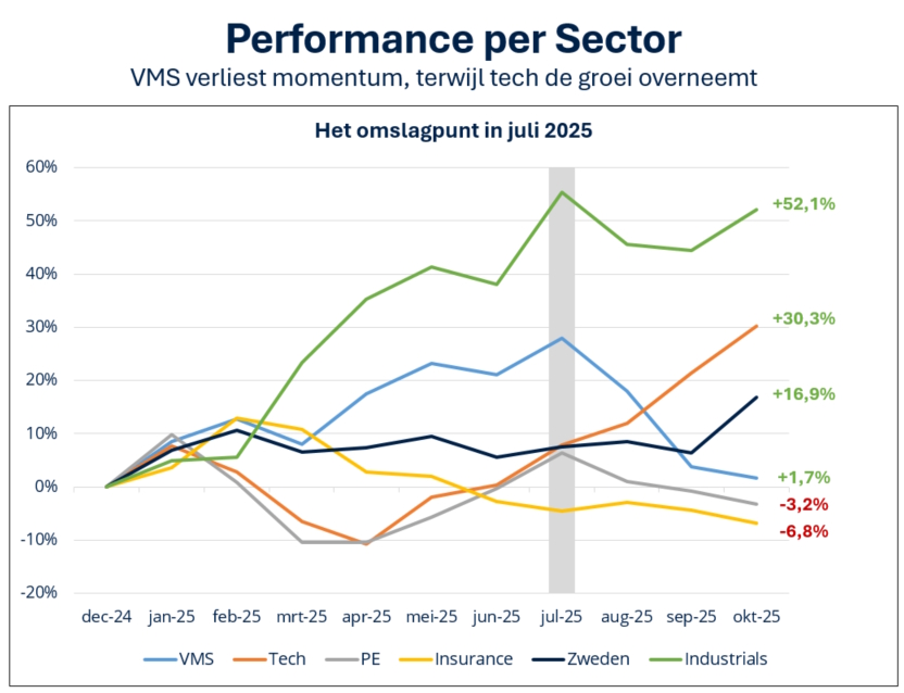 Het jaar 2025 kende een sterke start, grotendeels gedragen door Vertical Market Software (VMS) en industrials. Vooral industrial MBB, waarvan CEO Constantin Mang twee jaar op rij onze gastspreker was, trok dit jaar de kar met een rendement van meer dan 95% tot en met oktober.