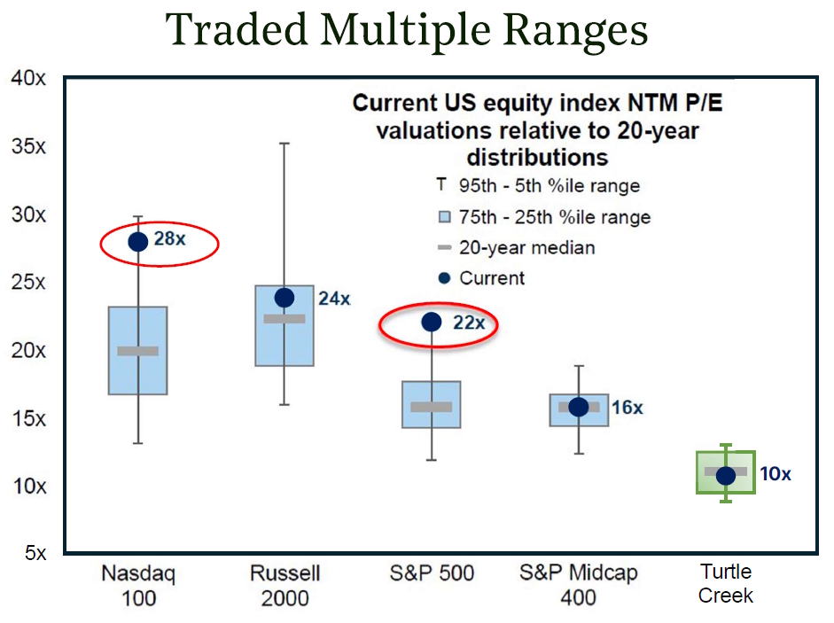 Tegenover die dure markt zette Brenton zijn eigen strategie, die hij omschrijft als “A different kind of value investing. A better kind of private equity.” Hij illustreerde dit punt met een krachtige grafiek (hieronder weergegeven) die de waarderingen van vandaag in historisch perspectief plaatst. Terwijl de Nasdaq op 28x de winst handelt en de S&P 500 op 22x (beide aan de absolute bovenkant van hun 20-jarige mediaan), handelt de geconcentreerde portefeuille van Turtle Creek op een historisch lage 10x de winst.
